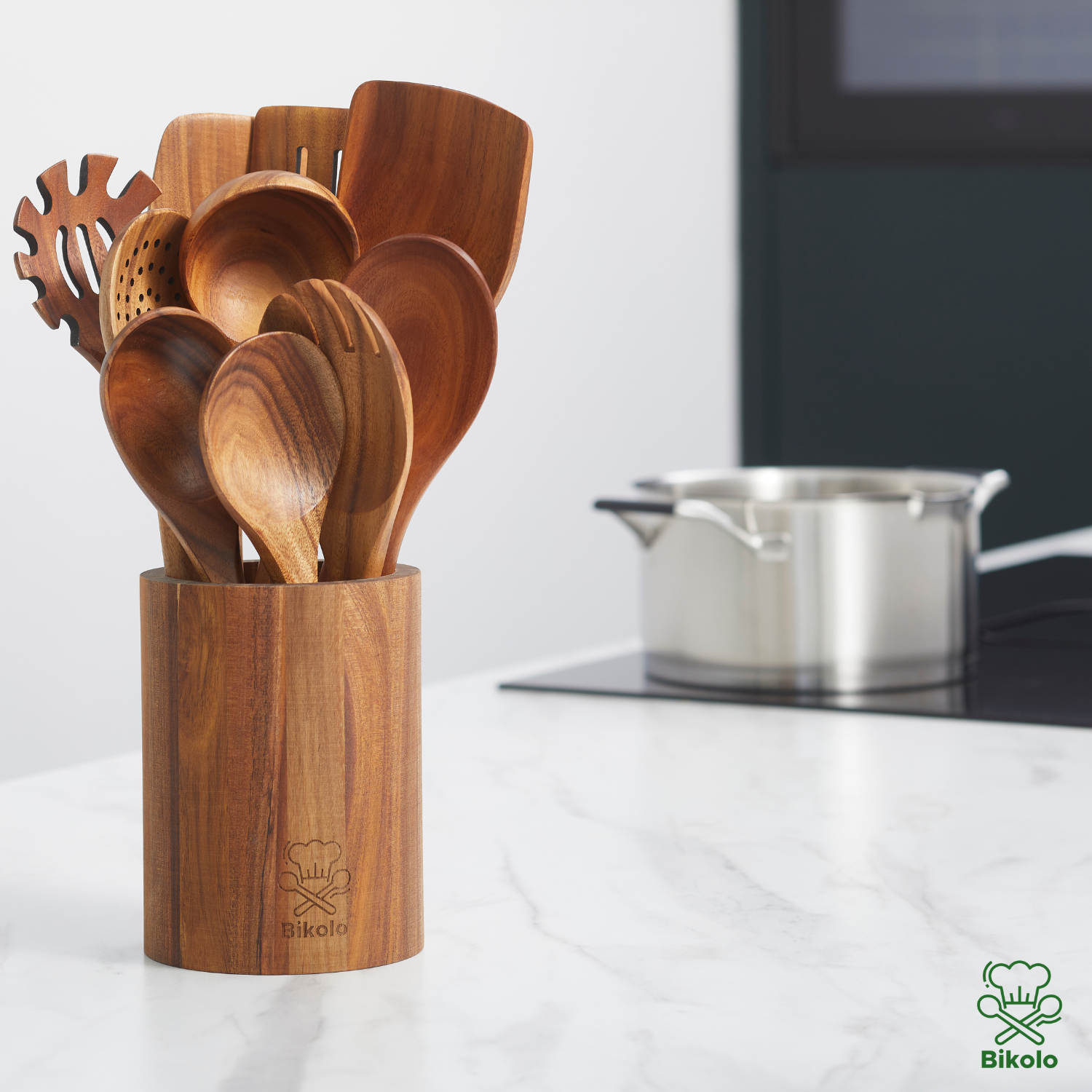 Breng stijl, duurzaamheid en functionaliteit samen in je keuken met de 10-delige houten keukengerei set van Bikolo inclusief houder.